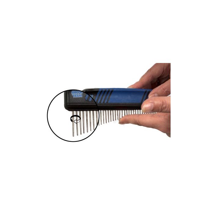 Ovaj novi češalj Show Tech brenda sa rotirajućim zupcima koji se i uvlače, omogućava grumerima da potpuno prodru u dlaku, bez straha da će povrediti psa.