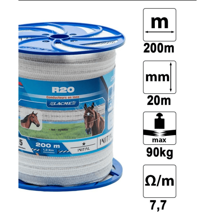 Traka za električnog pastira bela 20mmx200m Ruban Easy R20 je napravljena od plastičnih vlakana za bolju zateznu čvrstoću, sadrži 5 metalnih povodnika koja provode struju. Otporan na UV, omogućava im duži životni vek. Ove trake su namenjene za upotrebu na kratkim ogradama sa malo vegetacije za domaće životinje, idealno je za konje i krave. Jasno je vidljiv zbog svoje širine i bele boje, odlikuje se visoko zateznom čvrstoćom.